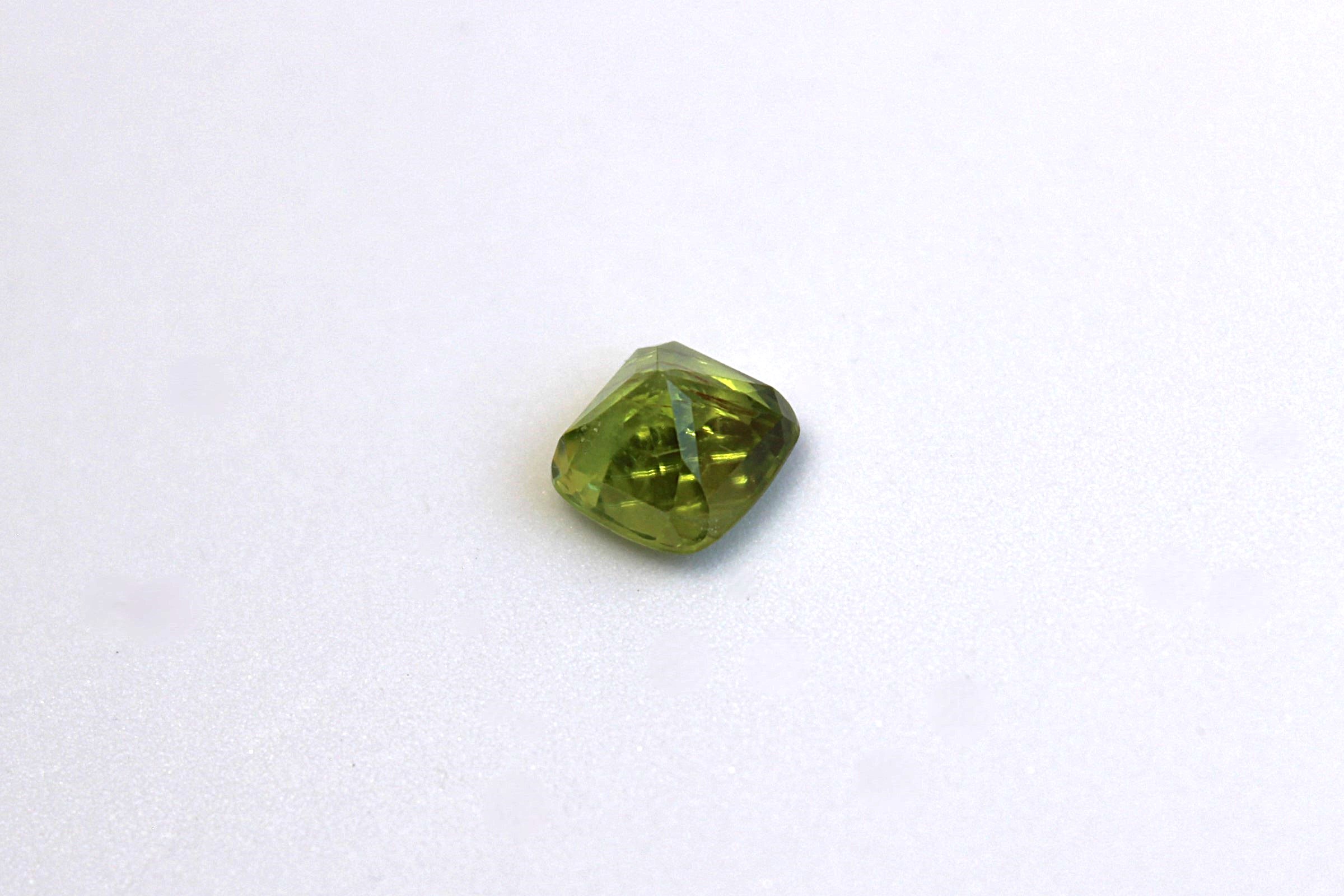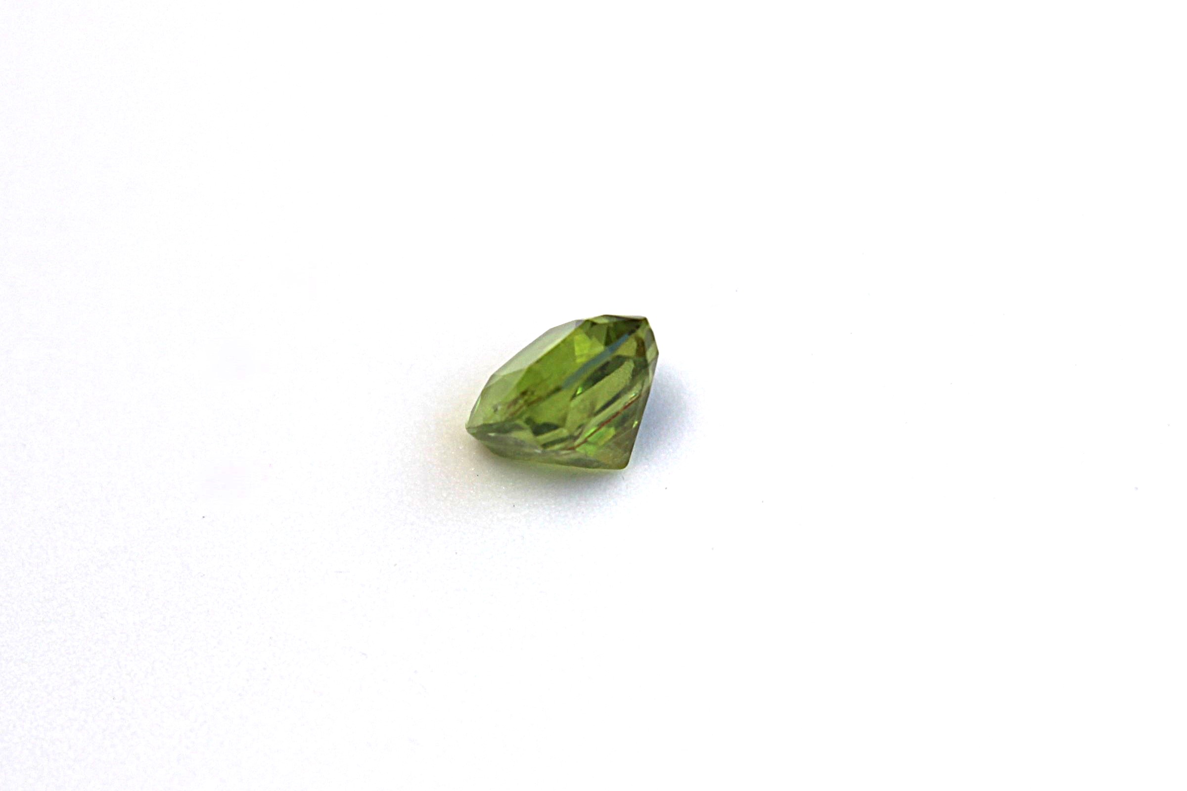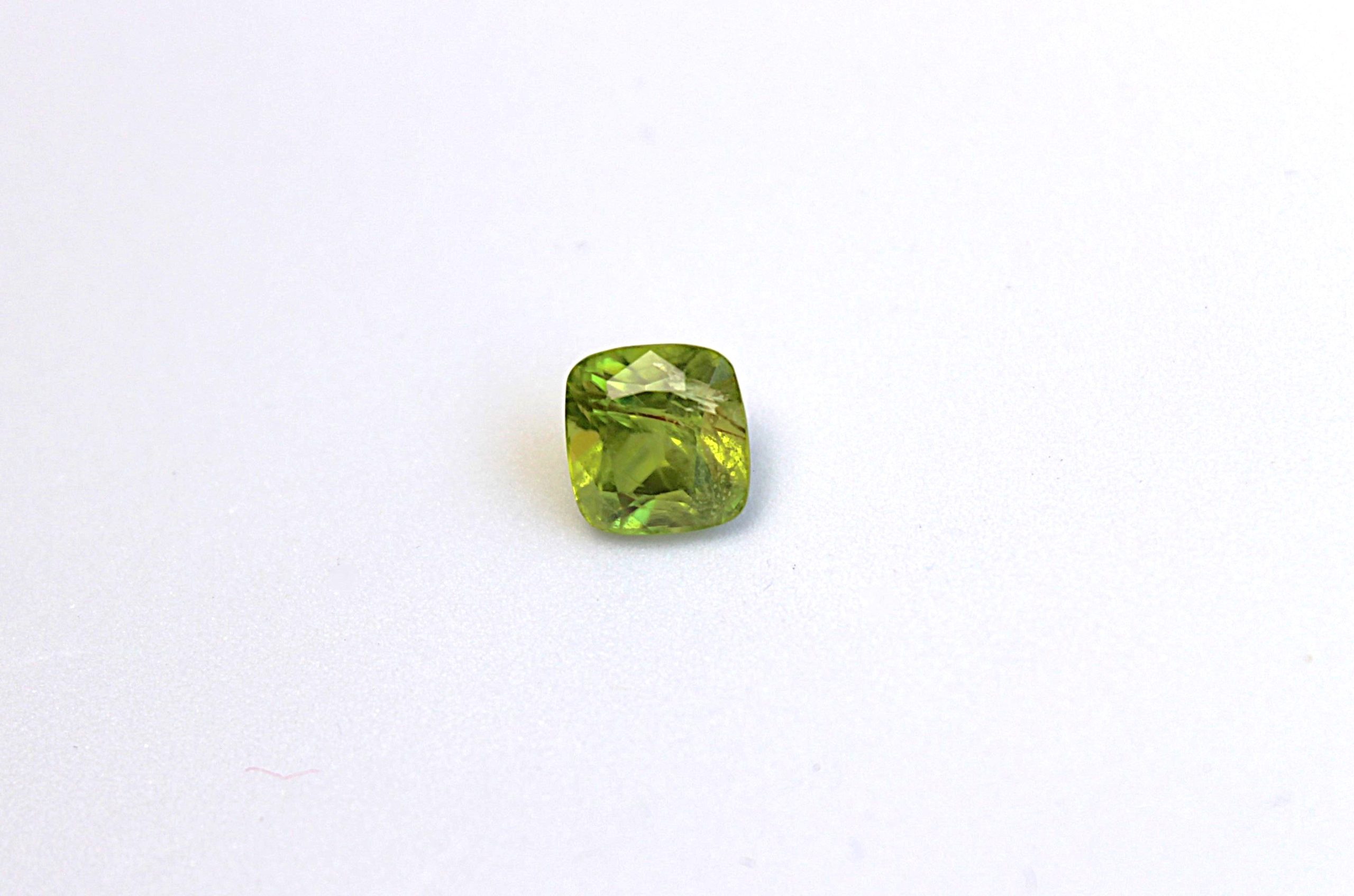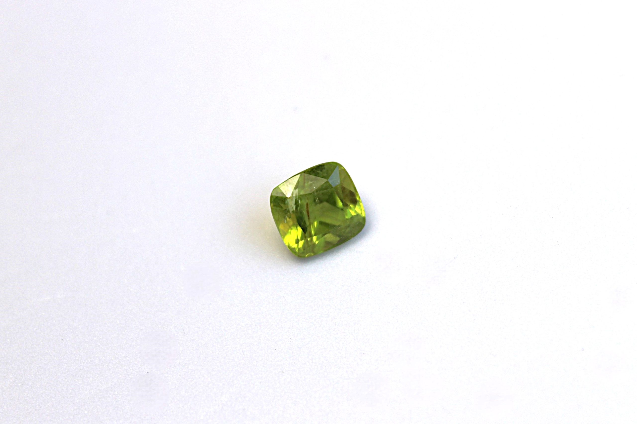 This amazing medium yellowish green Peridot in cushion cut weights 3.25 ct. The gemstone shows a good cut.